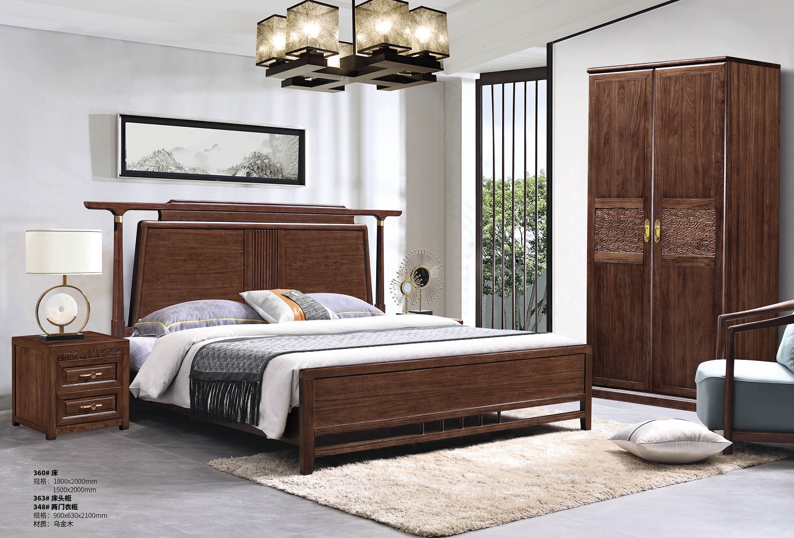 新中式乌金木床360#、床头柜363#、两门衣柜348#