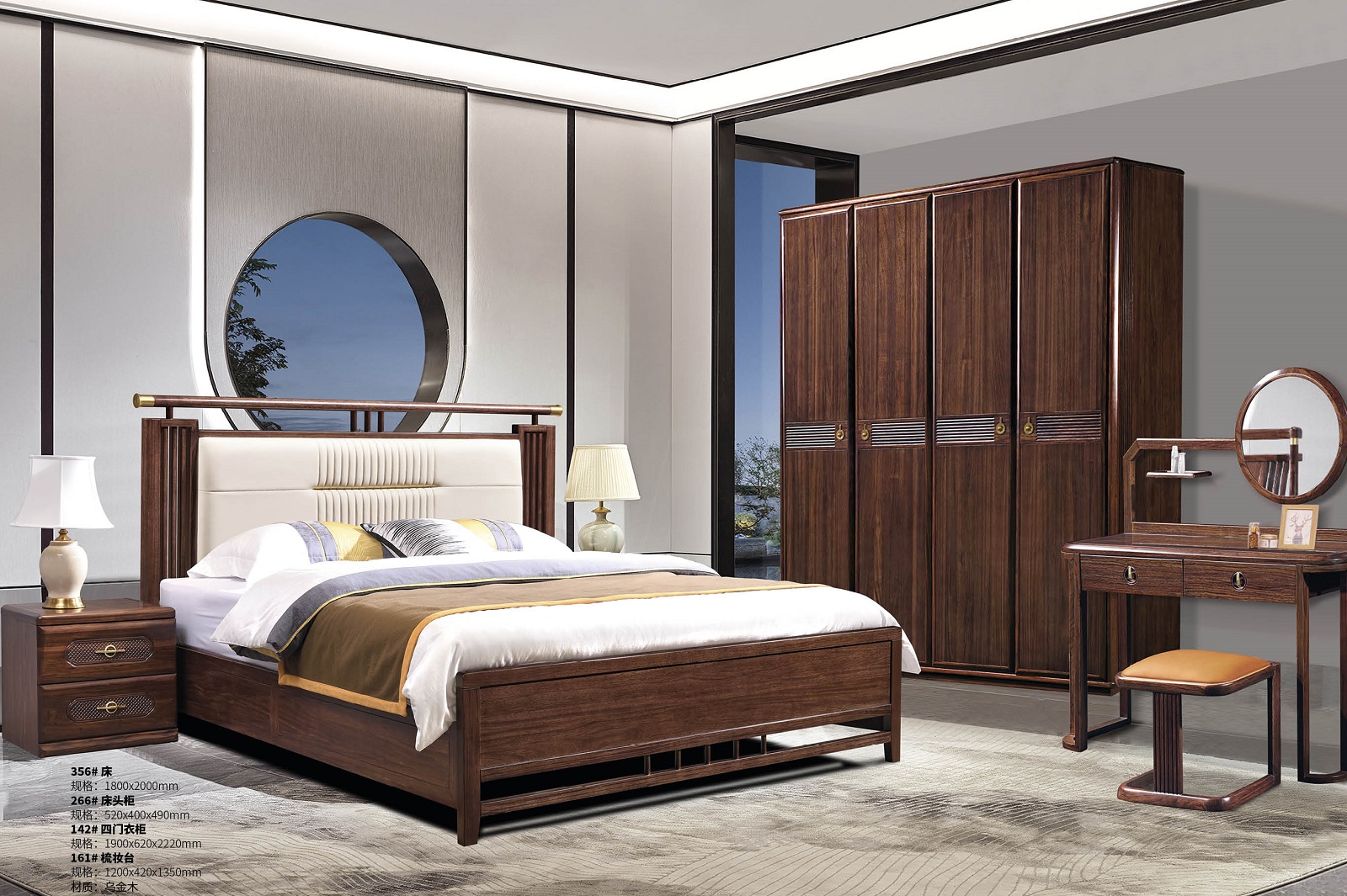 新中式乌金木床356#、床头柜266#、四门衣柜142#、梳妆台161#